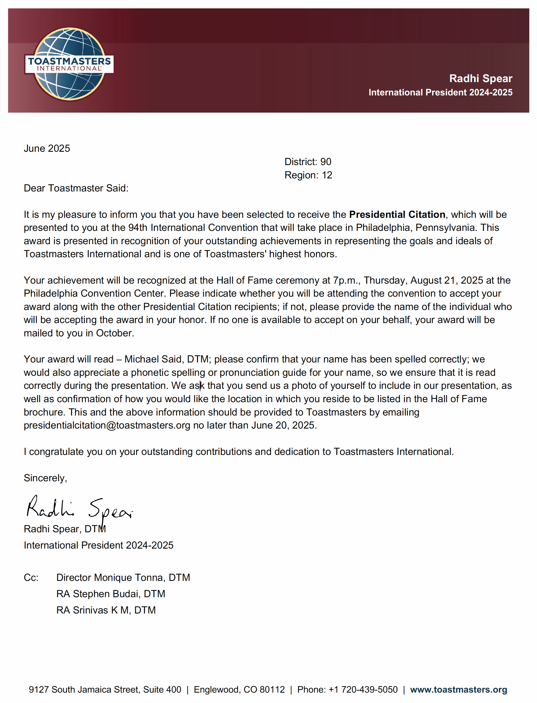 Congratulations to past Region 12 Advisor, past District 90 Director and District 70 2014-2015 Lieutenant Governor Marketing, Michael Said, DTM, in receiving a Presidential Citation at the Toastmasters International 2025 Convention, in recognition for outstanding achievement in representing the goals & ideals of Toastmasters.