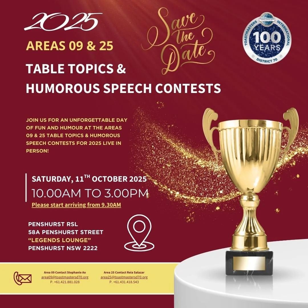 Area 9 and Area 25 Speech Contests Saturday 11 October 2025 10:00 am 3:00 pm 10:00 15:00 penhurst street Penshurst Street Penshurst, NSW, 2222 Australia (map) Google Calendar ICS Time will be from 10.00am to 3.00pm with an arrival from 9.30am onward.